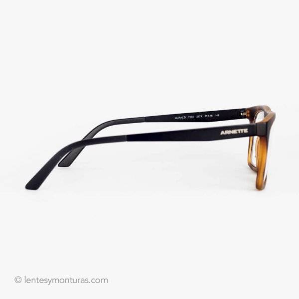Las gafas de vista ARNETTE MURAZZI 7174 / 2375f son una elección moderna y llamativa. Las varillas son anchas y cuentan con el corte distintivo “A-cut” de la marca en el extremo. Además, vienen en los nuevos y exclusivos colores estilo teñido con nudos, así como en cristal y negro